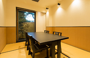 1階には8名様掛けの個室を1部屋と、庭に臨む6名様掛けの個室を2部屋ご用意しております。2名様からご利用いただけるとあって、接待や顔合わせ、記念日などの少人数のお食事に人気です。腰掛けイスタイプと座布団タイプをお選びいただけますので、ご予約の際にご希望をお伝えください。